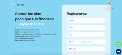 Trive es un broker internacional con sede en Europa que ofrece acceso a acciones estadounidenses, ETFs, Forex, índices, materias primas y CFDs. Funciona mediante su propia plataforma web y app móvil, junto con integración a MetaTrader 4 y MetaTrader 5, lo que facilita su uso para quienes ya están familiarizados con estas herramientas.
